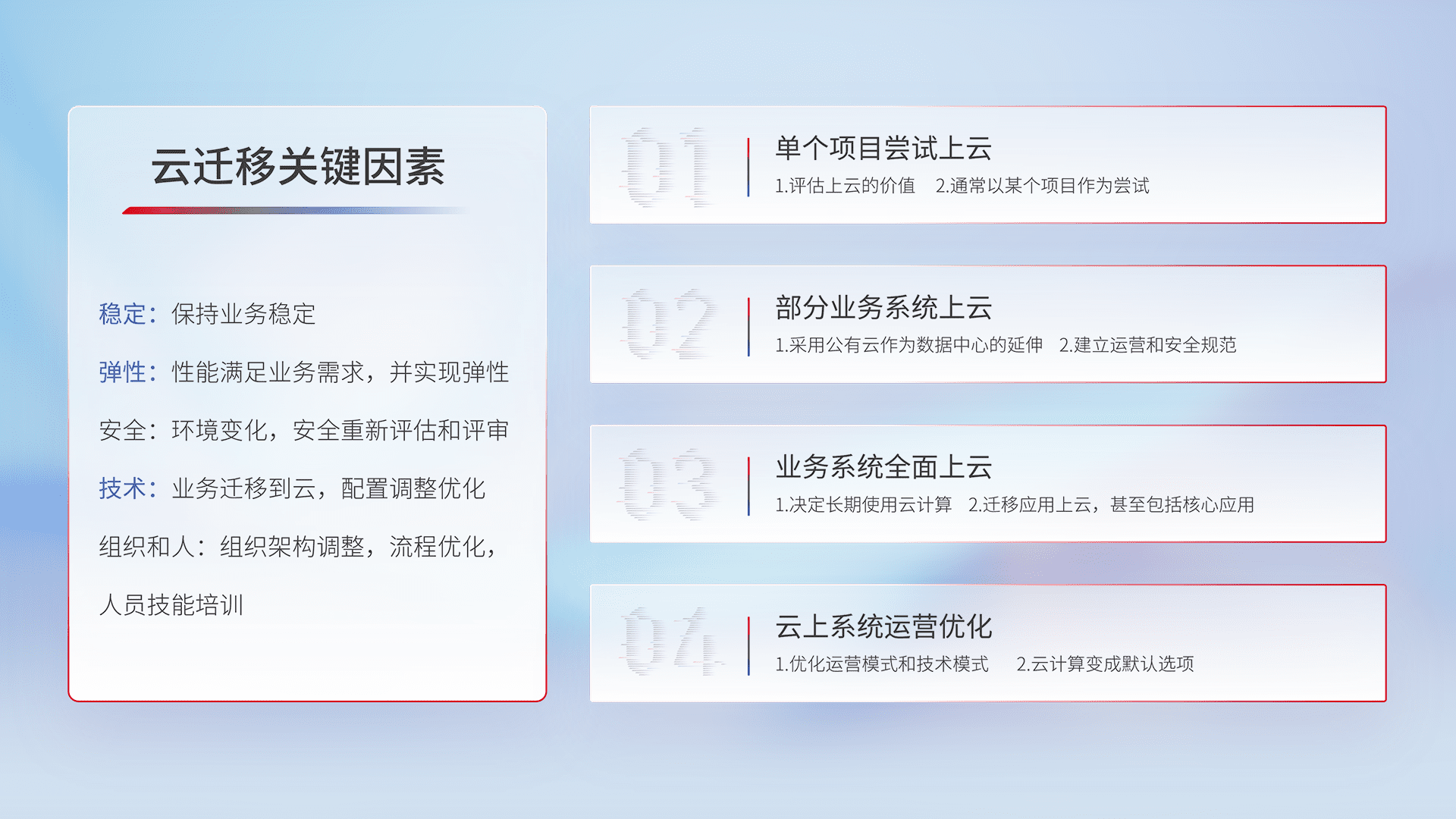 结合实际业务,,从规划设计、、、云平台选型、、云原生改造、、、、数据迁移、、、集成交付,,,,迁移全过程为客户识别最佳上云路径,,,,做好风险识别管理,,,设计网络架构、、、、身份权限、、、安全审计合规、、、操作审计、、、日志审计、、、监控告警策略、、多站点容灾设计等,,对云上基础设施进行整体规划,,提升IT治理水平,,,,以满足弹性、、、、高可用、、、高性能的需求。。。